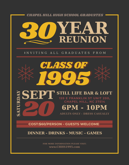 As we mark the milestones since graduation, this space will serve as a hub for news, photos, event details, and personal updates from Tigers everywhere. We invite you to browse the galleries, share your story, and stay in the loop about all things CHHS Class of ’95. Let’s make this next chapter just as unforgettable as the last!